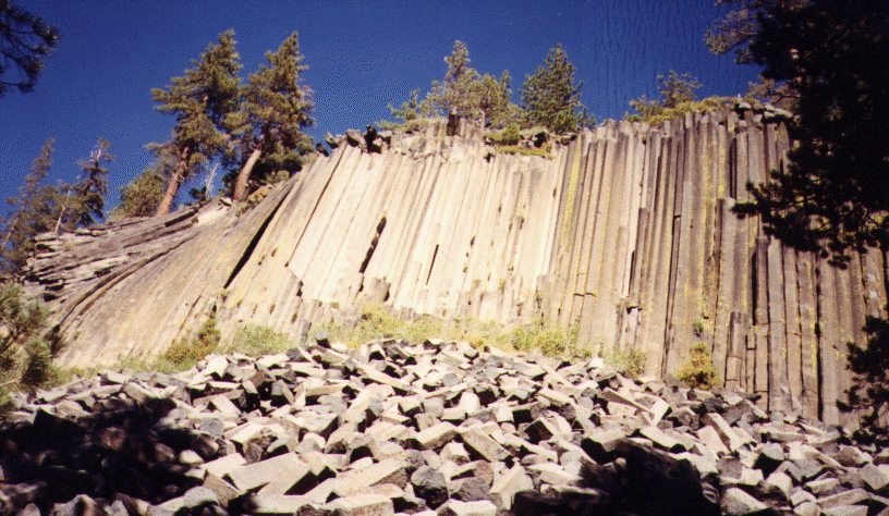 Devil's Postpile National Monument also offers a stunning view of a interesting rock formation caused by the cooling and cracking of basalt lava flow from volcanic vents. Sometimes, the lava cools to form huge columns (60 feet high, the Devil's Postpile), with incredibly uniform shapes. It's worth climbing to the top of the Postpile to see exactly the geometry of the columns.