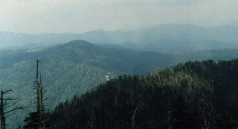 The next day, we headed to the Great Smoky Mountains National Park, "the majestic climax of the Appalachian Highlands." I had been here earlier in 1992, as part of a class trip where I spent hiking the park, learning about the various plants in one of the world's finest examples of temperate deciduous forests. As we drove through Gatlinburg, I couldn't help but think how gaudy it had become (not that it was in a pristine stage to begin with). The park itself was also quite crowded, but it was much better than the traffic in Gatlinburg. The Smoky Mountains are so named because because of the smoke-like haze enveloping the mountains, "which stretch in sweeping troughs and mighty billows to the horizon." The first thing we did was climb to the top of Clingman's dome and enjoy the breathtaking view of the Smokies. We then went down to Alum Cove Buffs where we did about a 3 mile hike, and proceeded west on I-40.